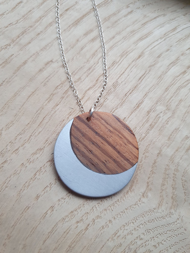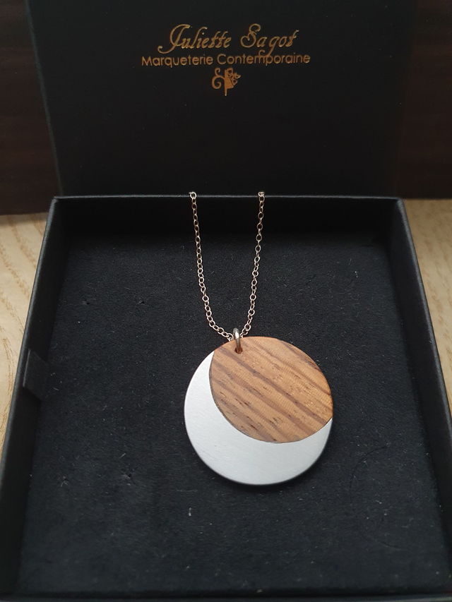 Médaillon en marqueterie de bois et métal (zebrano et lune en aluminium)